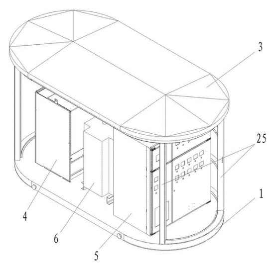 箱體外殼由材料層、龍骨與防護鋼板層三層組成,可以較好地對變電站內的用電設備進行較好地保護;箱體外殼為橢圓柱狀,結構更加緊密牢固。箱體外殼的前表面設置有雙開門,箱體外殼的表面均勻地設置有電纜線孔且所述電纜線孔內貫穿有電纜線。與周圍的環境相適應,同時也提高了變電站的通風散熱的效率。