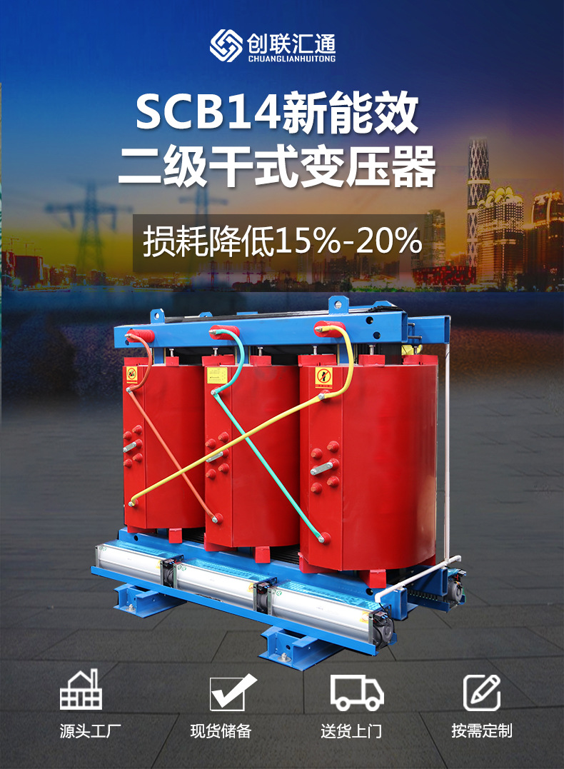 SCB14系列干式變壓器能效等級幾級?SCB14變壓器能效等級滿足2020年新國標能效等級二級標準,是常見的符合二級能效的干式變壓器型號,創聯匯通電器公司生產SCB14干式變壓器源頭廠家。